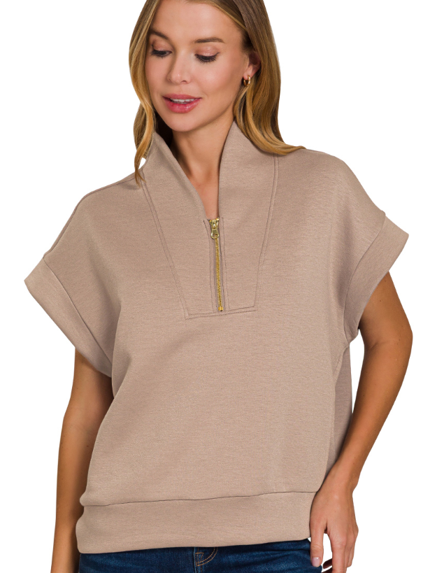 Scuba high neck half zip top. Gold zipper and mock collar provides sophistication to this comfortable top.