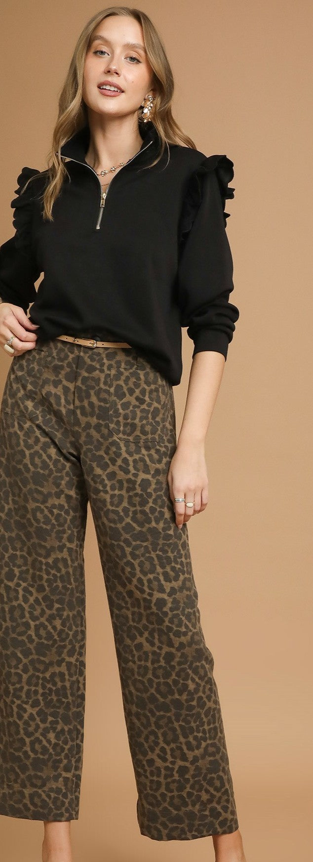Black Luxeknit Collared Ruffle Shoulder Quarter-Zip Pullover.