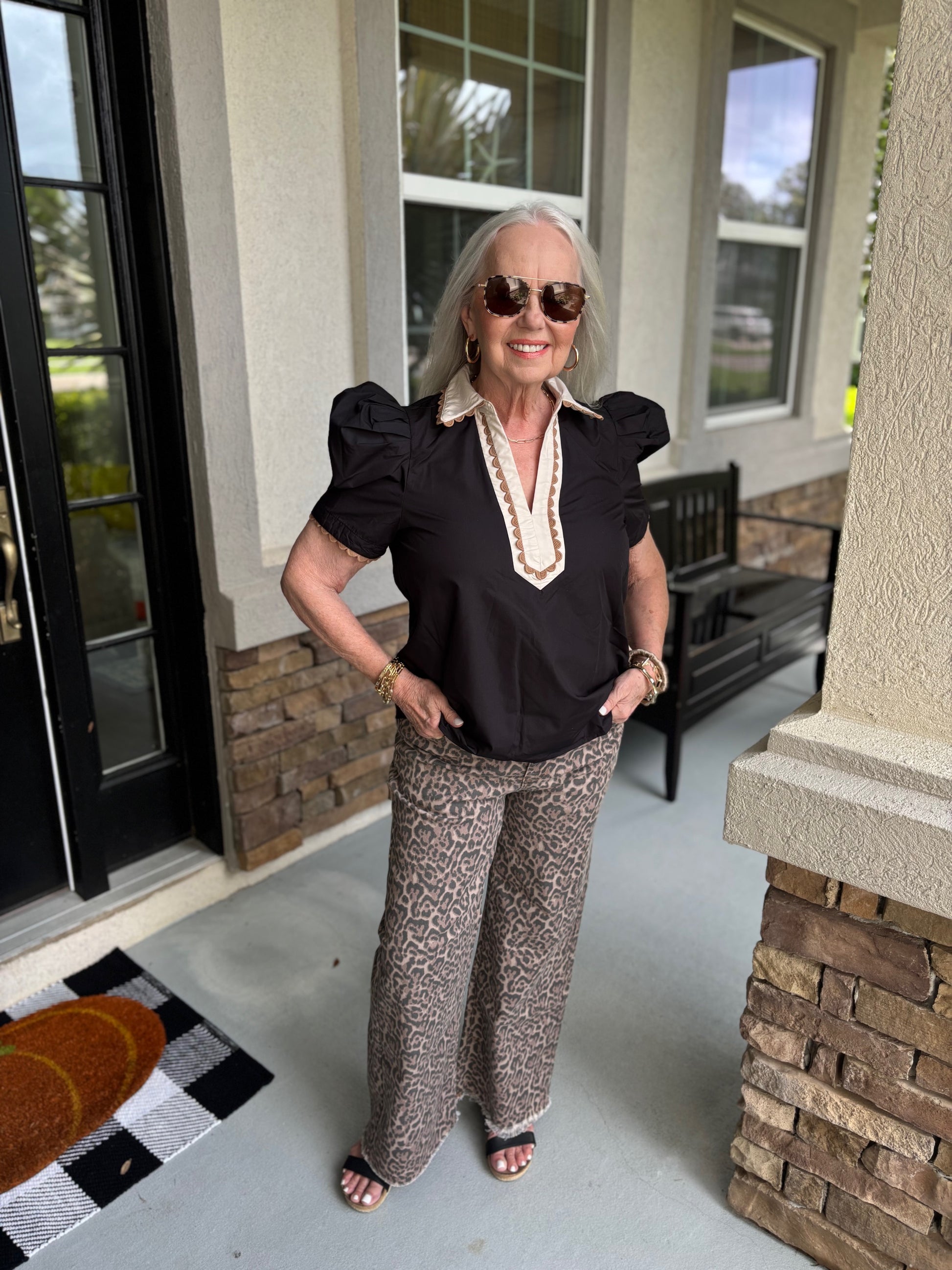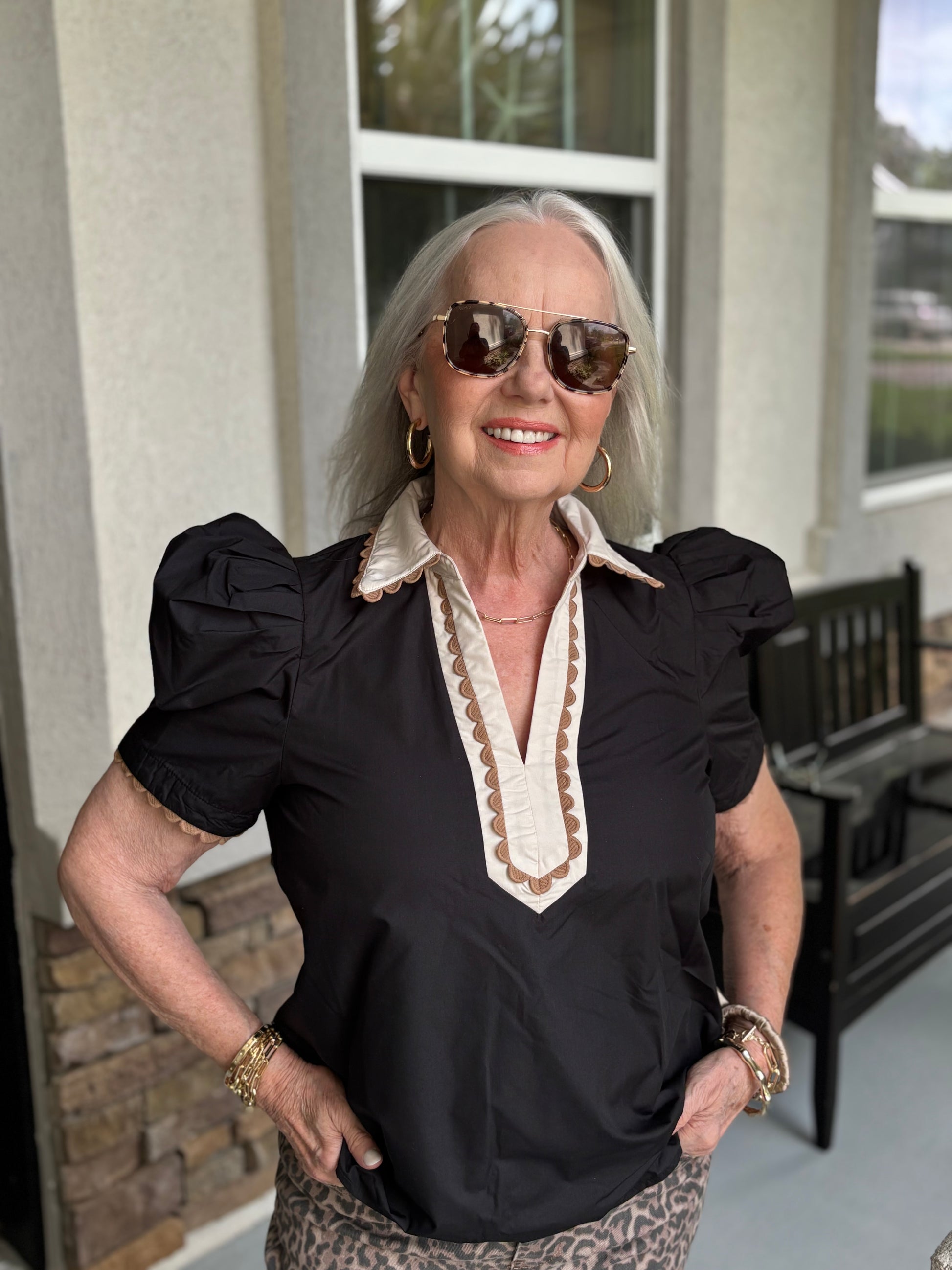 Black & Tan Puff Sleeve Top with Scallop Trim